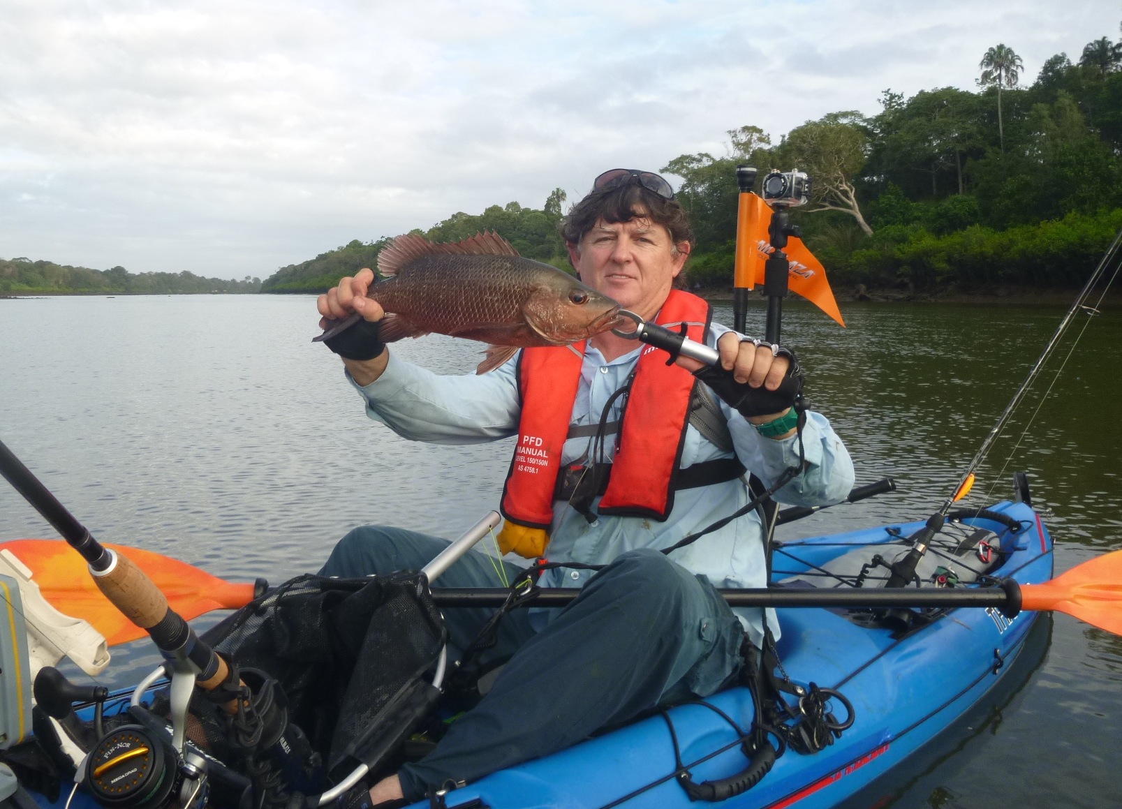 Pedro and I then moved further upstream throwing lures at any likely looking snags and peppering the rock bars. I had a big hit from what I thought was a Mangrove Jack but did not hook up and I couldn’t persuade it to replicate its original interest in my popper. Then I detected some commotion coming from Pedros direction and could tell instantly he was on to a good fish. Fighting out in open water he made it look easy and boated a very solid looking Mangrove Jack of 44cm. To see my good fishing mate land his first Mangrove Jack from a kayak was priceless and we were both ecstatic. A quality fish and a new PB for Qwikdraw.